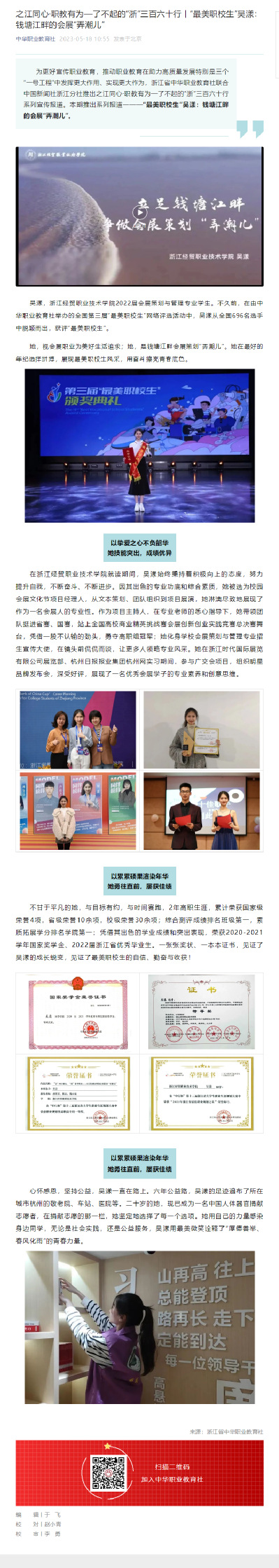 中华职业教育社、浙江省中华职业教育社 | 之江同心·职教有为—了不起的“浙”三百六十行丨“最美职校生”吴漾:钱塘江畔的会展“弄潮儿”