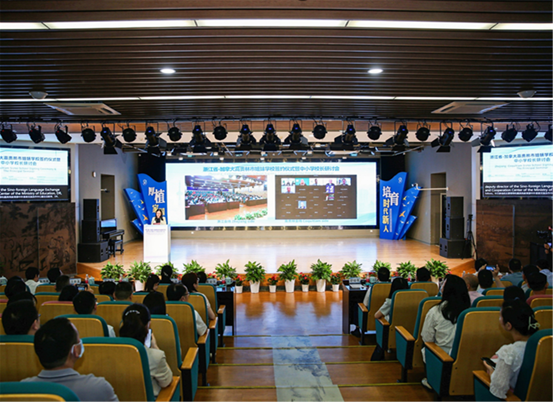 杭州外国语学校、宁波市第二中学、嘉兴市实验小学等39所学校与高贵林市中小学校签订了姐妹学校协议。随后,两地校长围绕“面向未来的全人教育”主题开展了深入研讨。杭州市胜利小学的同学们表演了精彩的亚运主题节目。